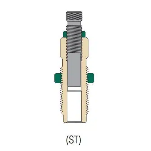 These molded seating dies feature a separate bottom punch for seating the case body to the shoulder. This is the preferred method for seating military and target bullets for long-term accuracy. When a crimp is necessary the expander ball is moved to the rear and the bullet is backed out the rest of the case. Because there is less wear on the case neck these dies are often used in sets with other dies. The benefit of the rear punch is that it allows a number of calibers to be used. Because both the pilot and seating stem are on the same side of the case neck the seating die is able to cycle smoothly and concentrically. Because there is less friction the case can be seated to the limit of the case neck rather than through the whole length of the case.